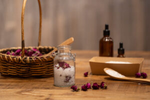 無農薬の食香バラを使ったバスソルトづくりができます。バスソルトとしてバラの香りを楽しんでみてください。