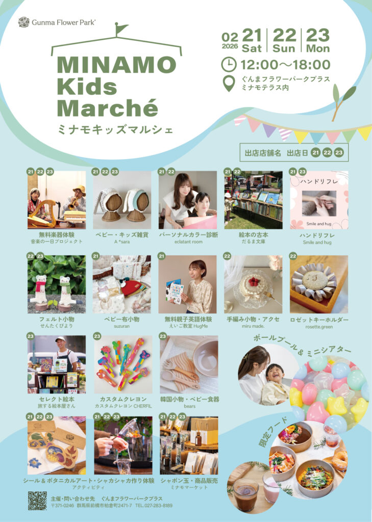 室内開催のミニマルシェ。ベビー雑貨やハンドメイド小物の他に絵本やマッサージ、アクティビティのワークショップ体験など様々なジャンルの店舗がぐんまフラワーパークプラスに集まります。